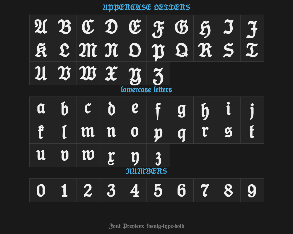 | Copyright | Copyright (c) Typographer Mediengestaltung, 2002. All rights reserved. Koenig-Type Jugendstilfraktur geschaffen von Heinz Koenig, 1907-1910. Digitalisiert durch Dieter Steffmann, Kreuztal. |