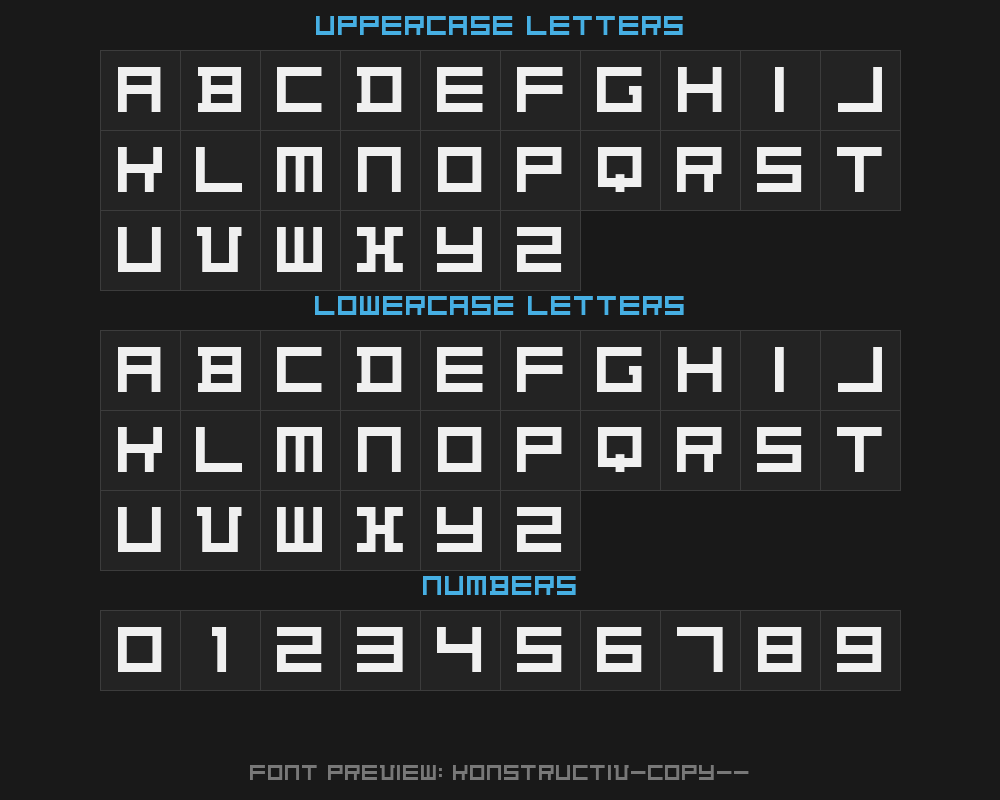konstructiv-copy-1- is a font file with a size of 0.02 MB. The full font name is Konstructiv, 1.0 version. It contains 96 characters, supports 8 Chinese characters. The copyright belongs to Konstructiv. konstructiv-copy-1- font is available for free download, but commercial use requires confirmation on the Konstructiv official website whether it's free for commercial use.