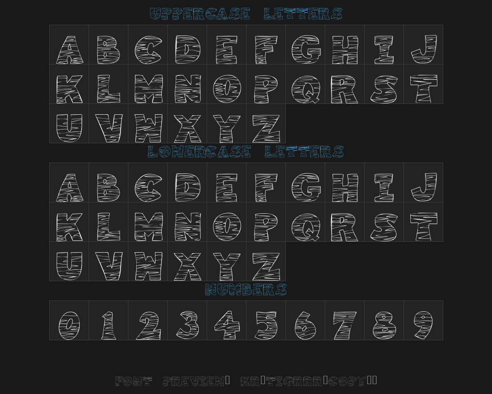 kr-tigrrr-copy-1- is a font file with a size of 0.07 MB. The full font name is KR Tigrrr, Macromedia Fontographer 4.1 3 25 2006 version. It contains 64 characters, supports 8 Chinese characters. The copyright belongs to KR Tigrrr. kr-tigrrr-copy-1- font is available for free download, but commercial use requires confirmation on the KR Tigrrr official website whether it's free for commercial use.