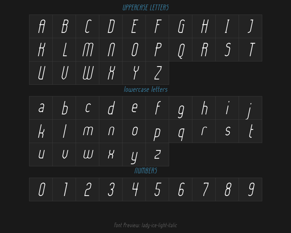 lady-ice-light-italic is a font file with a size of 0.04 MB. The full font name is Lady Ice - Light Italic, 1.0 version. It contains 217 characters, supports 8 Chinese characters. The copyright belongs to Lady Ice - Light. lady-ice-light-italic font is available for free download, but commercial use requires confirmation on the Lady Ice - Light official website whether it's free for commercial use.