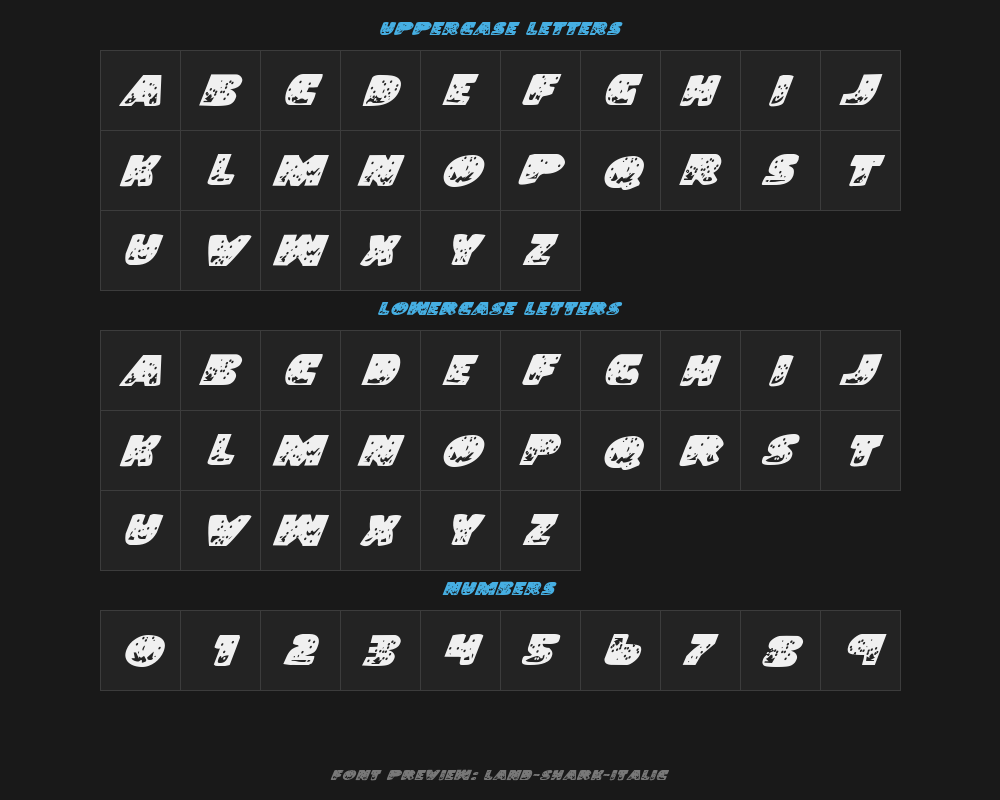 land-shark-italic is a font file with a size of 0.04 MB. The full font name is Land Shark Italic, 1.0 version. It contains 100 characters, supports 8 Chinese characters. The copyright belongs to Land Shark Italic. land-shark-italic font is available for free download, but commercial use requires confirmation on the Land Shark Italic official website whether it's free for commercial use.