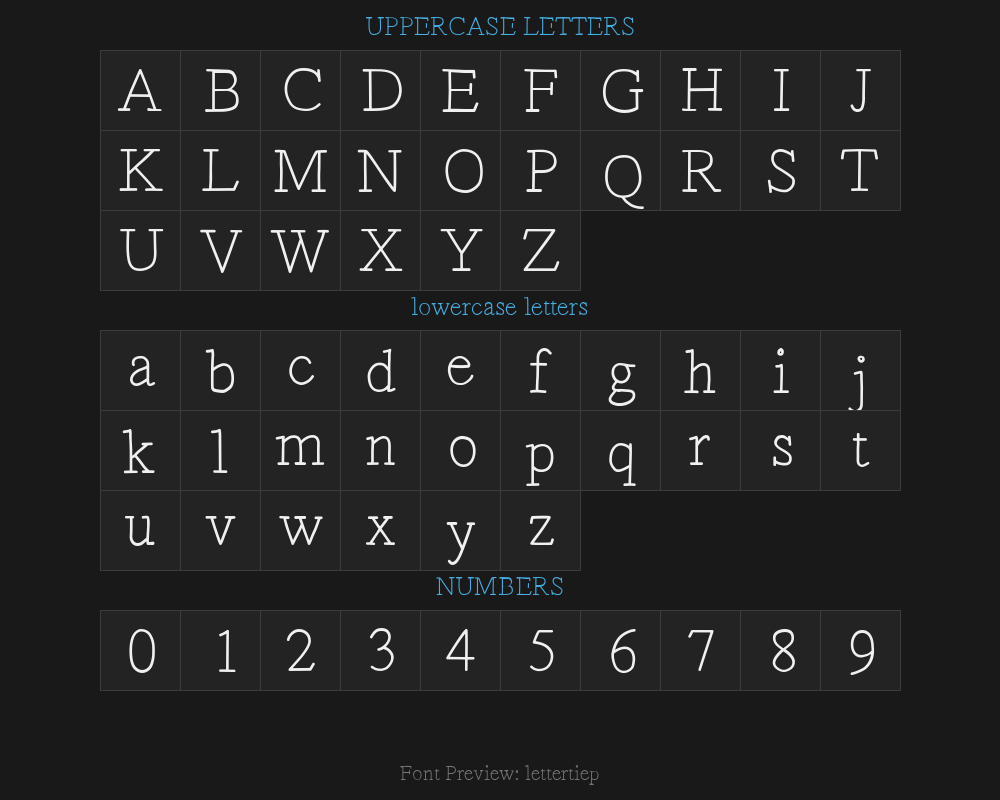 lettertiep is a font file with a size of 0.04 MB. The full font name is Lettertiep, Macromedia Fontographer 4.1.4 03‐05‐2003 version. It contains 171 characters, supports 8 Chinese characters. The copyright belongs to Lettertiep. lettertiep font is available for free download, but commercial use requires confirmation on the Lettertiep official website whether it's free for commercial use.