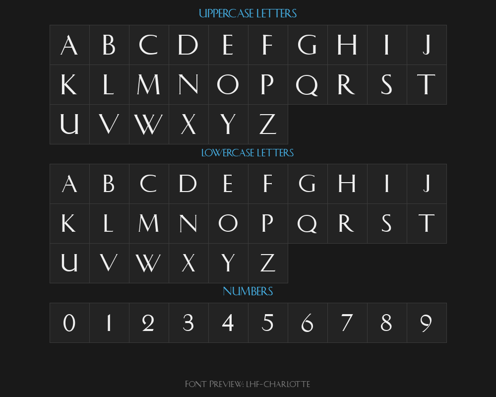 lhf-charlotte is a font file with a size of 0.06 MB. The full font name is LHF Charlotte, 1 11.1.02 www.letterheadfonts.com version. It contains 188 characters, supports 8 Chinese characters. The copyright belongs to LHF Charlotte. lhf-charlotte font is available for free download, but commercial use requires confirmation on the LHF Charlotte official website whether it's free for commercial use.