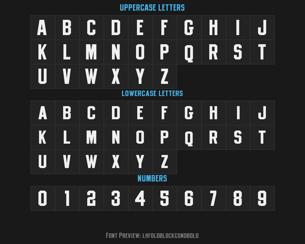 lhfoldblockcondbold is a font file with a size of 0.02 MB. The full font name is LHFOldBlockCondBold, 001.000 version. It contains 180 characters, supports 8 Chinese characters. The copyright belongs to LHFOldBlockCondBold. lhfoldblockcondbold font is available for free download, but commercial use requires confirmation on the LHFOldBlockCondBold official website whether it's free for commercial use.