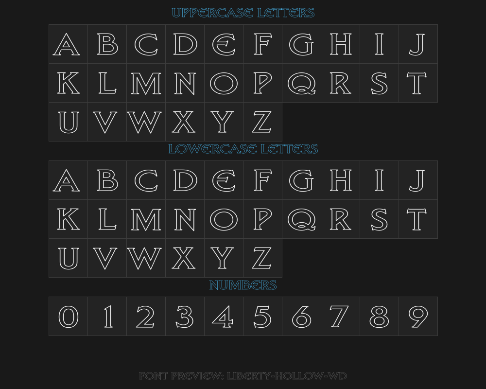 liberty-hollow-wd is a font file with a size of 0.08 MB. The full font name is Liberty Hollow Wd, 1.0 version. It contains 394 characters, supports 8 Chinese characters. The copyright belongs to Liberty Hollow Wd. liberty-hollow-wd font is available for free download, but commercial use requires confirmation on the Liberty Hollow Wd official website whether it's free for commercial use.