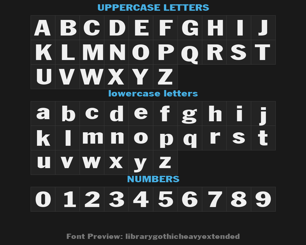 librarygothicheavyextended is a font file with a size of 0.05 MB. The full font name is LibraryGothicHeavyExtended, Rev. 003.000 version. It contains 234 characters, supports 8 Chinese characters. The copyright belongs to LibraryGothicHeavyExtended. librarygothicheavyextended font is available for free download, but commercial use requires confirmation on the LibraryGothicHeavyExtended official website whether it's free for commercial use.
