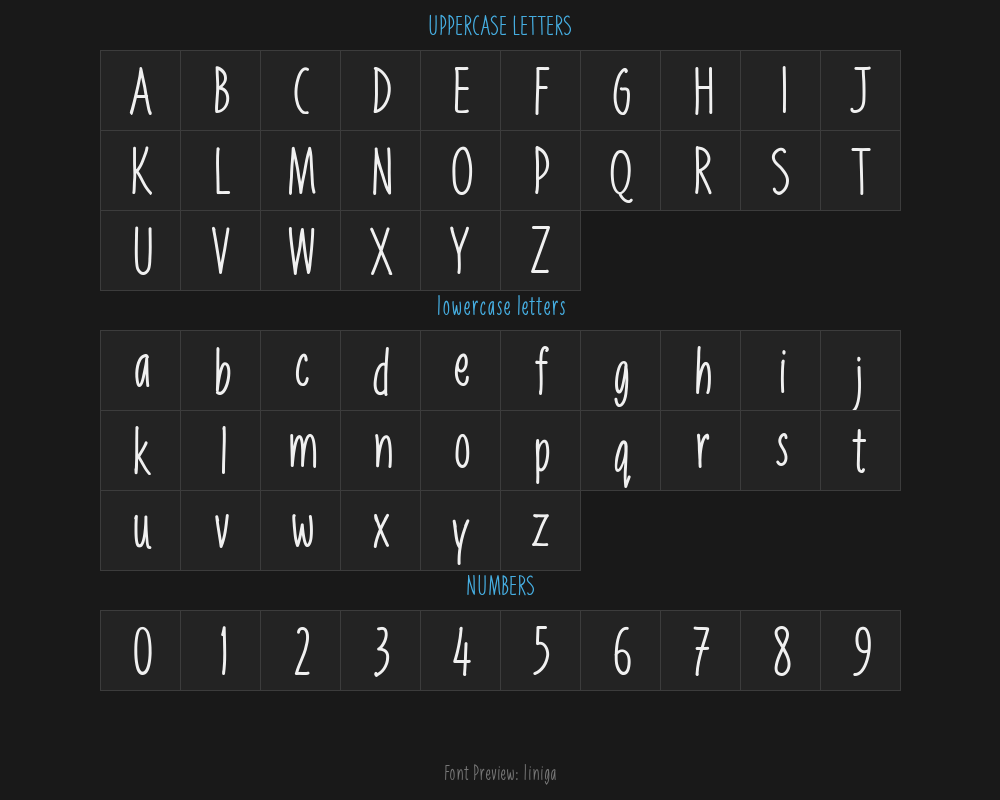 liniga is a font file with a size of 0.14 MB. The full font name is Liniga, Version 1.000 version. It contains 313 characters, supports 8 Chinese characters. The copyright belongs to Liniga. liniga font is available for free download, but commercial use requires confirmation on the Liniga official website whether it's free for commercial use.