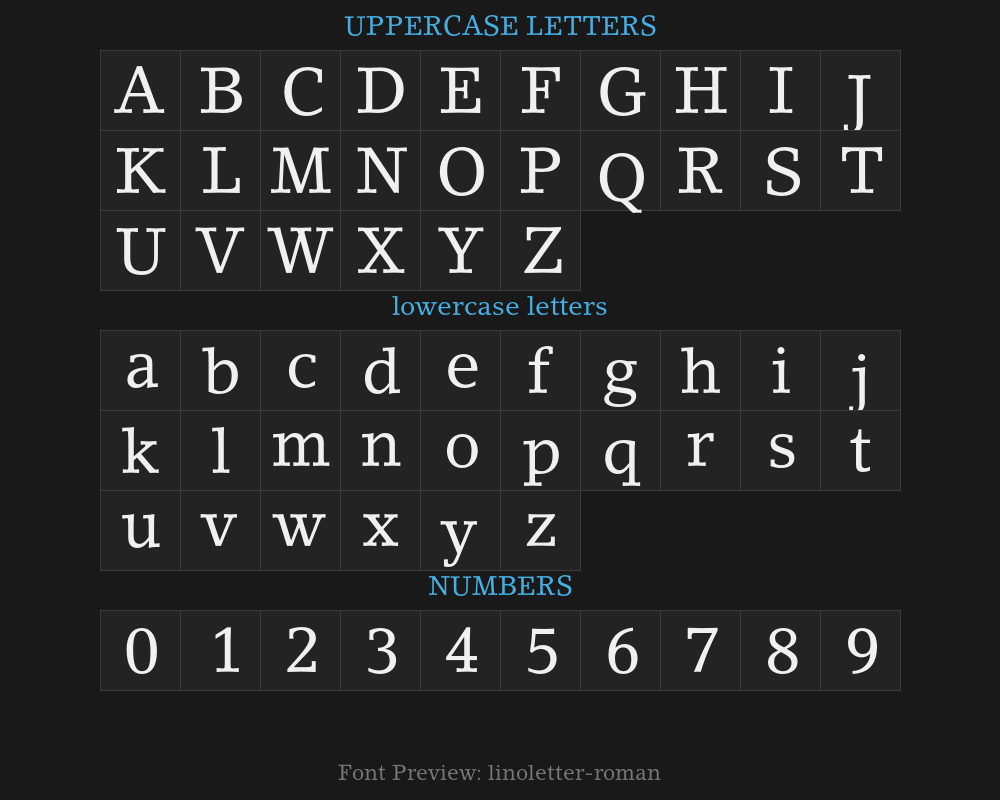 linoletter-roman is a font file with a size of 0.04 MB. The full font name is LinoLetter-Roman, 001.000 version. It contains 228 characters, supports 8 Chinese characters. The copyright belongs to LinoLetter. linoletter-roman font is available for free download, but commercial use requires confirmation on the LinoLetter official website whether it's free for commercial use.