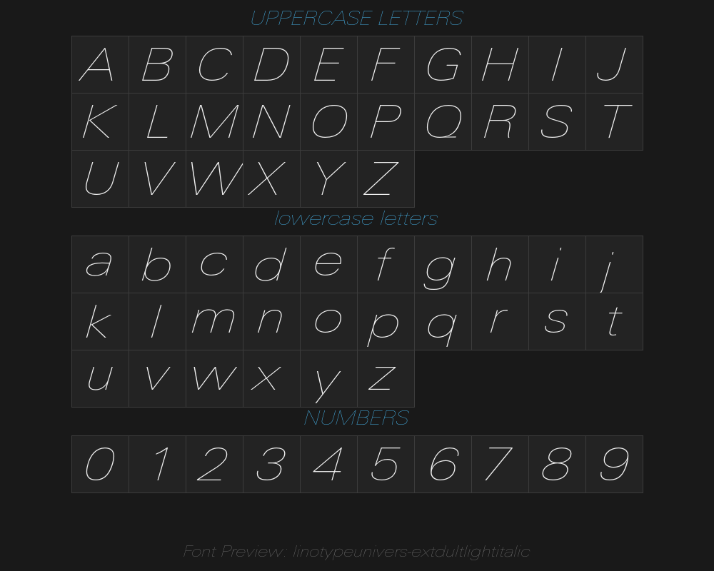 | PostScript name | LinotypeUnivers-ExtdUltLightItalic |