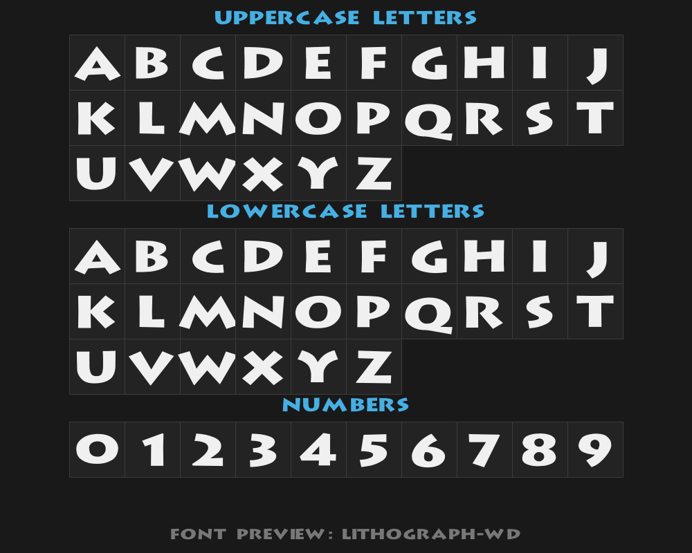 lithograph-wd is a font file with a size of 0.05 MB. The full font name is Lithograph Wd, 1.0 version. It contains 394 characters, supports 8 Chinese characters. The copyright belongs to Lithograph Wd. lithograph-wd font is available for free download, but commercial use requires confirmation on the Lithograph Wd official website whether it's free for commercial use.