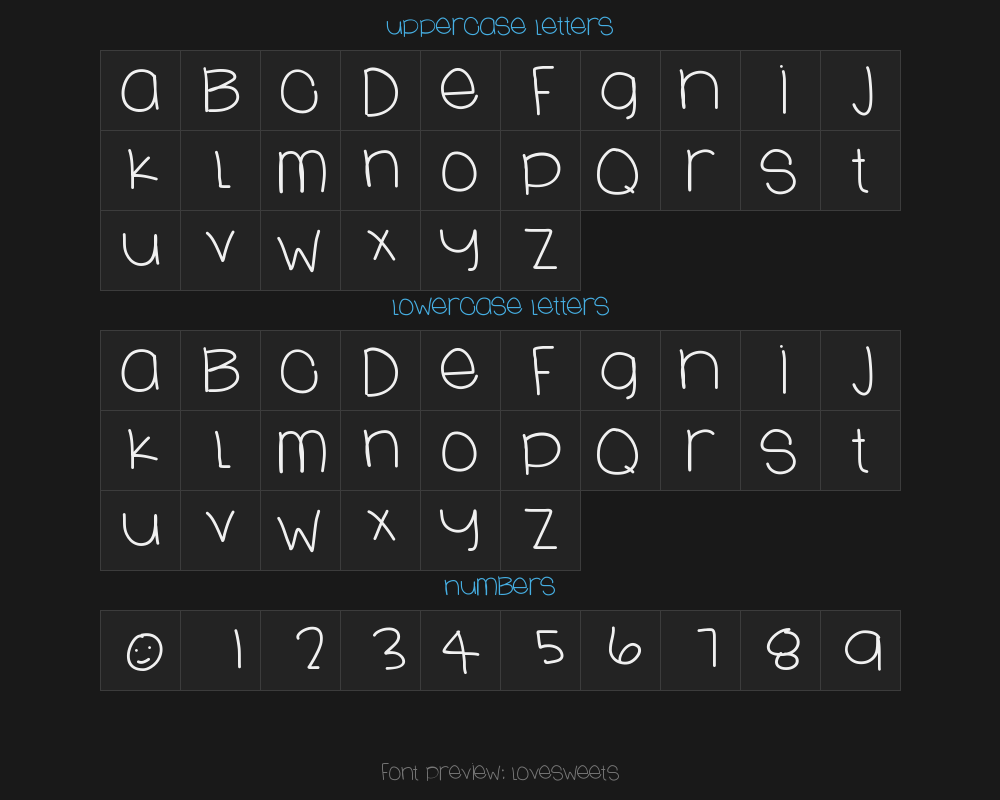 lovesweets is a font file with a size of 0.02 MB. The full font name is LoveSweets, Version 001.000 version. It contains 100 characters, supports 8 Chinese characters. The copyright belongs to LoveSweets. lovesweets font is available for free download, but commercial use requires confirmation on the LoveSweets official website whether it's free for commercial use.