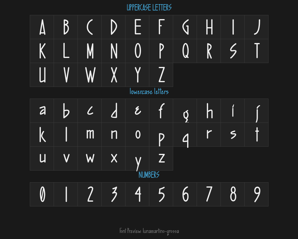 lunamartino-grossa is a font file with a size of 0.04 MB. The full font name is LunaMartino-Grossa, Version 1.00 version. It contains 126 characters, supports 8 Chinese characters. The copyright belongs to LunaMartino-Grossa. lunamartino-grossa font is available for free download, but commercial use requires confirmation on the LunaMartino-Grossa official website whether it's free for commercial use.