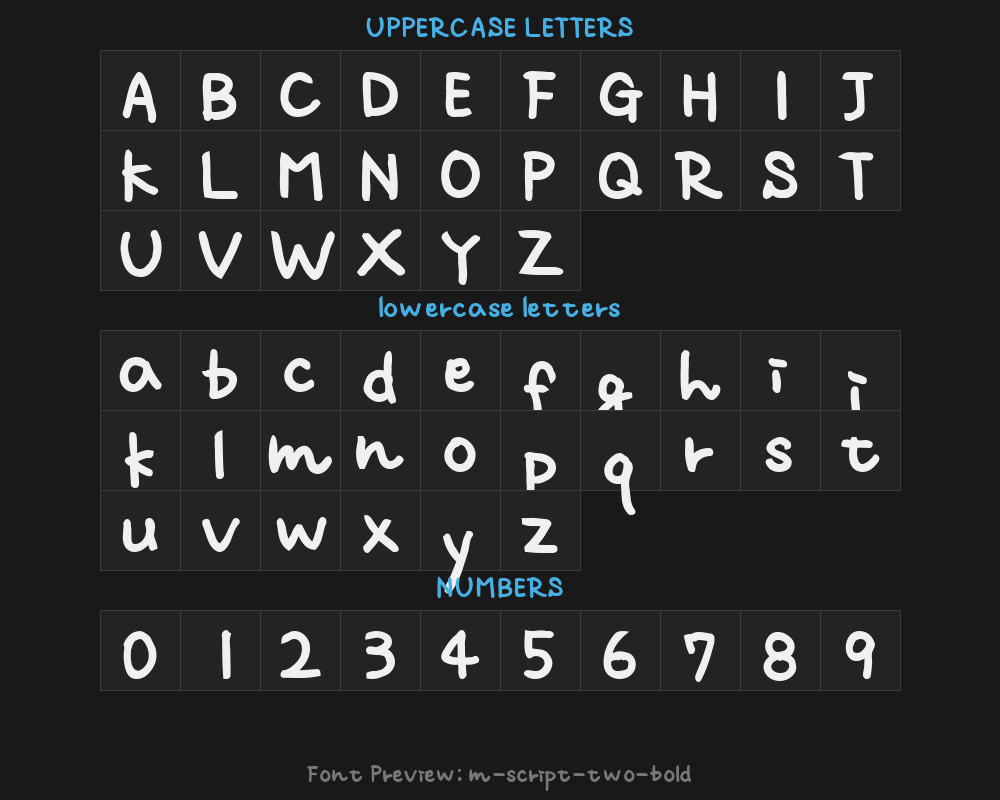 m-script-two-bold is a font file with a size of 0.03 MB. The full font name is m script Two Bold, Macromedia Fontographer 4.1J 00.12.21 version. It contains 112 characters, supports 8 Chinese characters. The copyright belongs to m script Two. m-script-two-bold font is available for free download, but commercial use requires confirmation on the m script Two official website whether it's free for commercial use.