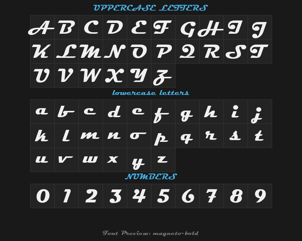 | Font description | Leslie Cabarga turned to the geometric, streamlined scripts prepared by American industrial designers for the inspiration of this series. In its three variation of letter spacing, Magneto recalls the chrome-strip lettering laid along the rounded shapes of refrigerator doors and automobile trunks in the forties and fifties; FB 1995. |