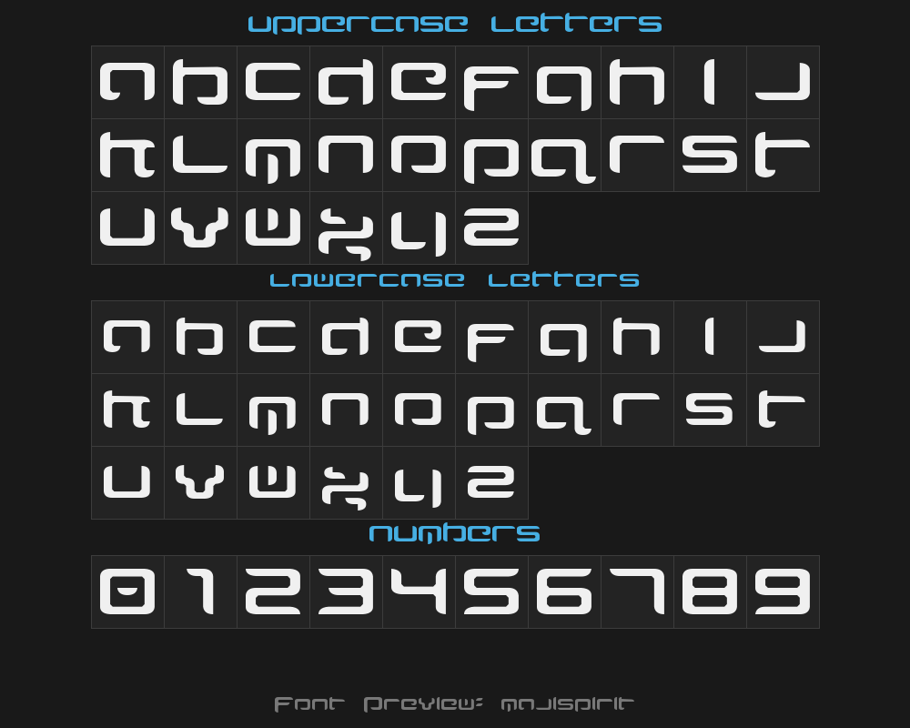 majispirit is a font file with a size of 0.02 MB. The full font name is Majispirit, Macromedia Fontographer 4.1J 01.8.23 version. It contains 85 characters, supports 8 Chinese characters. The copyright belongs to Majispirit. majispirit font is available for free download, but commercial use requires confirmation on the Majispirit official website whether it's free for commercial use.