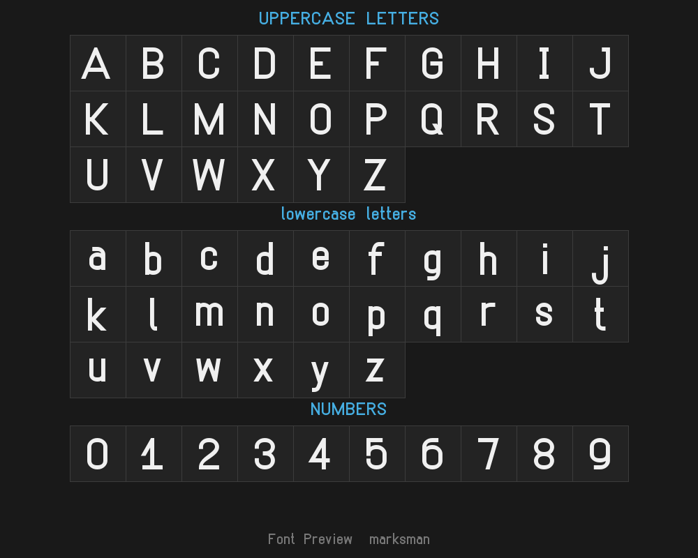 marksman is a font file with a size of 0.01 MB. The full font name is MARKSMAN, Version 1 version. It contains 66 characters, supports 8 Chinese characters. The copyright belongs to MARKSMAN. marksman font is available for free download, but commercial use requires confirmation on the MARKSMAN official website whether it's free for commercial use.