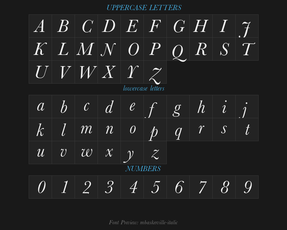 mbaskerville-italic is a font file with a size of 0.04 MB. The full font name is MBaskerville-Italic, 1 version. It contains 228 characters, supports 8 Chinese characters. The copyright belongs to Baskerville. mbaskerville-italic font is available for free download, but commercial use requires confirmation on the Baskerville official website whether it's free for commercial use.