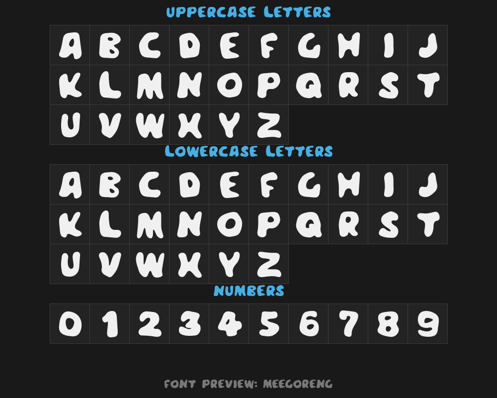 meegoreng is a font file with a size of 0.03 MB. The full font name is Meegoreng, Meegoreng version1.0 version. It contains 96 characters, supports 8 Chinese characters. The copyright belongs to Meegoreng. meegoreng font is available for free download, but commercial use requires confirmation on the Meegoreng official website whether it's free for commercial use.