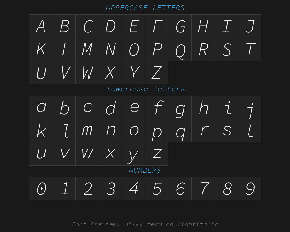 | PostScript name | Milky-Han-Term-CN-Light-Italic |