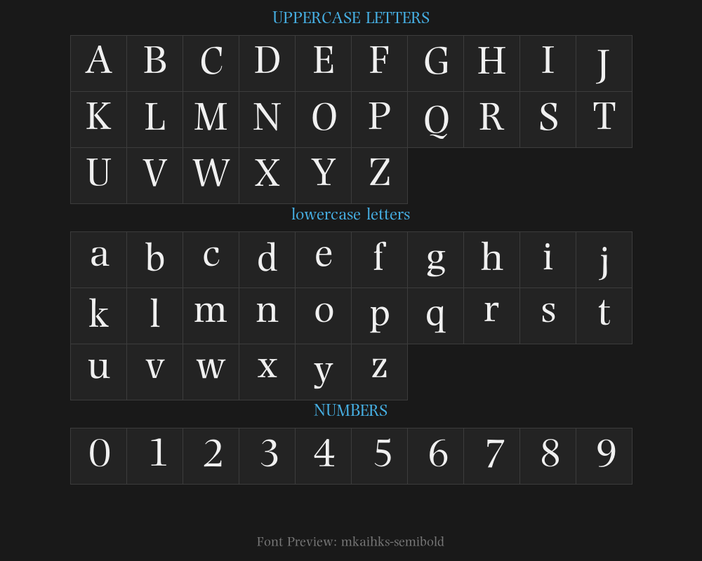 mkaihks-semibold is a font file with a size of 7.95 MB. The full font name is MKaiHKS-SemiBold, Version 1.10 version. It contains 23436 characters, supports 15280 Chinese characters. The copyright belongs to MKaiHKS-SemiBold. mkaihks-semibold font is available for free download, but commercial use requires confirmation on the MKaiHKS-SemiBold official website whether it's free for commercial use.