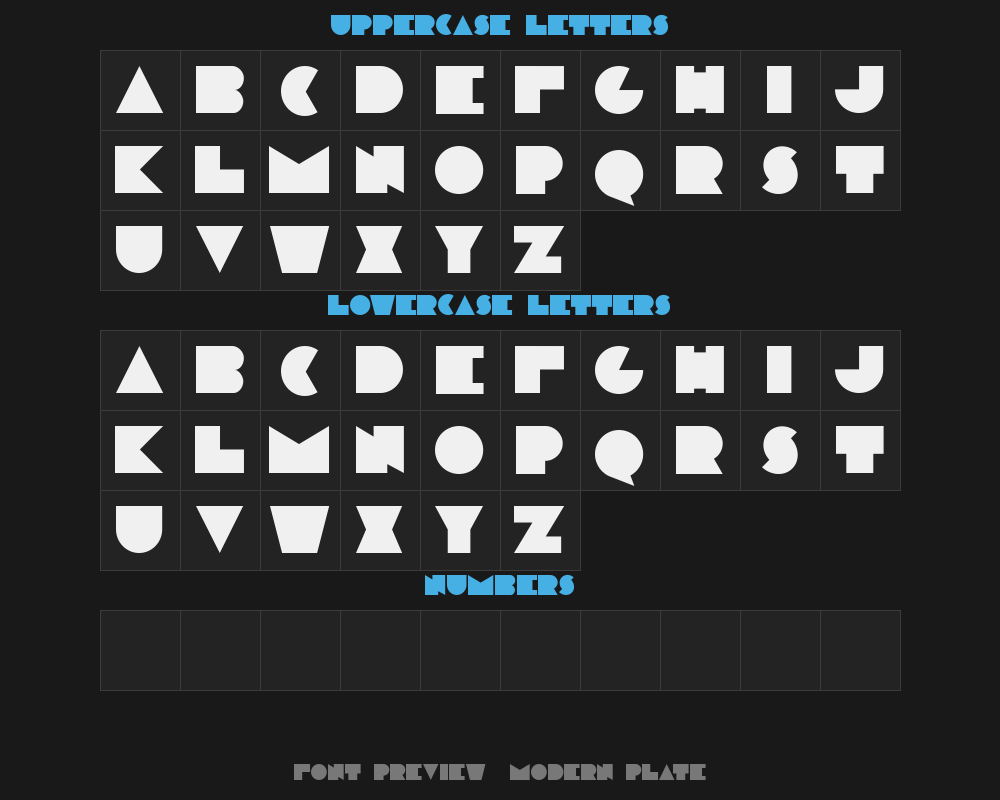 modern-plate is a font file with a size of 0.01 MB. The full font name is Modern plate, 1.0 version. It contains 56 characters, supports 8 Chinese characters. The copyright belongs to Modern plate. modern-plate font is available for free download, but commercial use requires confirmation on the Modern plate official website whether it's free for commercial use.