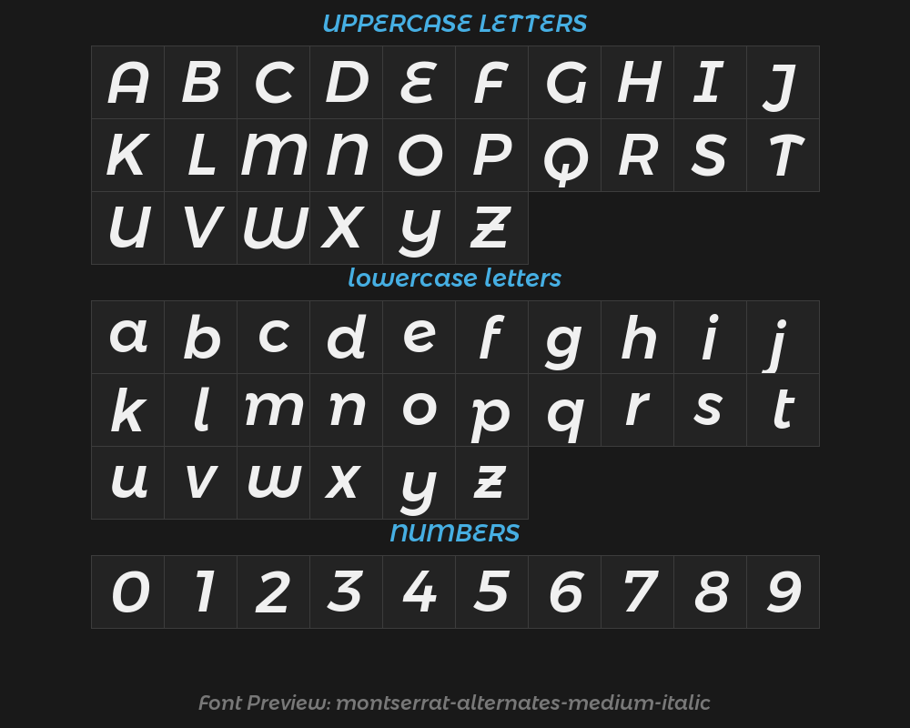montserrat-alternates-medium-italic is a font file with a size of 0.14 MB. The full font name is Montserrat Alternates Medium Italic, Version 6.001 version. It contains 707 characters, supports 8 Chinese characters. The copyright belongs to Montserrat Alternates Medium. montserrat-alternates-medium-italic font is available for free download, but commercial use requires confirmation on the Montserrat Alternates Medium official website whether it's free for commercial use.