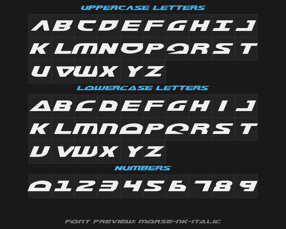 morse-nk-italic is a font file with a size of 0.04 MB. The full font name is Morse NK Italic, 2 version. It contains 219 characters, supports 8 Chinese characters. The copyright belongs to Morse NK Italic. morse-nk-italic font is available for free download, but commercial use requires confirmation on the Morse NK Italic official website whether it's free for commercial use.