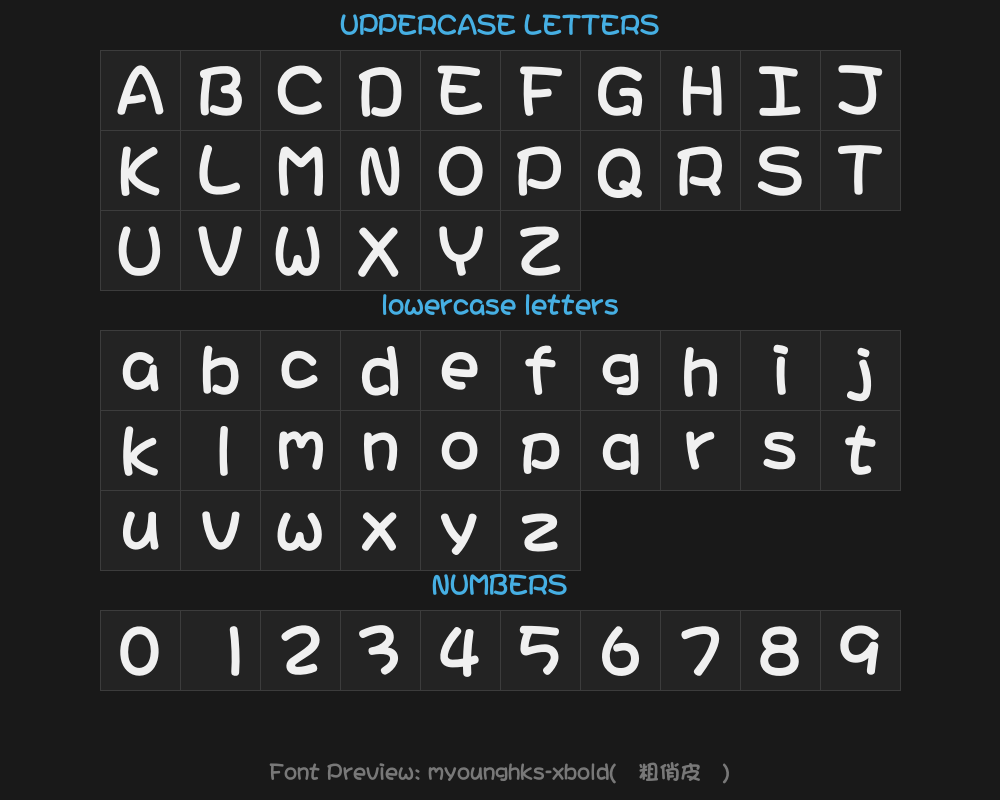 myounghks-xbold(Simple Bold Playful type is a font file with a size of 4.87 MB. The full font name is MYoungHKS-Xbold, Version 1.00 version. It contains 23436 characters, supports 15280 Chinese characters. The copyright belongs to MYoungHKS-Xbold. myounghks-xbold(Simple Bold Playful type font is available for free download, but commercial use requires confirmation on the MYoungHKS-Xbold official website whether it's free for commercial use.