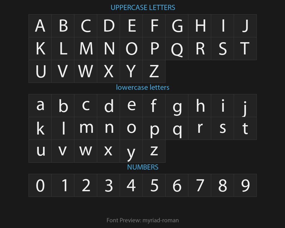 myriad-roman is a font file with a size of 0.03 MB. The full font name is Myriad-Roman, 001.000 version. It contains 228 characters, supports 8 Chinese characters. The copyright belongs to Myriad. myriad-roman font is available for free download, but commercial use requires confirmation on the Myriad official website whether it's free for commercial use.