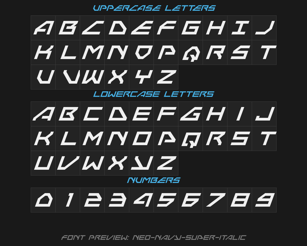 neo-navy-super-italic is a font file with a size of 0.02 MB. The full font name is Neo-Navy Super-Italic, Version 1.0; 2015 version. It contains 219 characters, supports 8 Chinese characters. The copyright belongs to Neo-Navy Super-Italic. neo-navy-super-italic font is available for free download, but commercial use requires confirmation on the Neo-Navy Super-Italic official website whether it's free for commercial use.