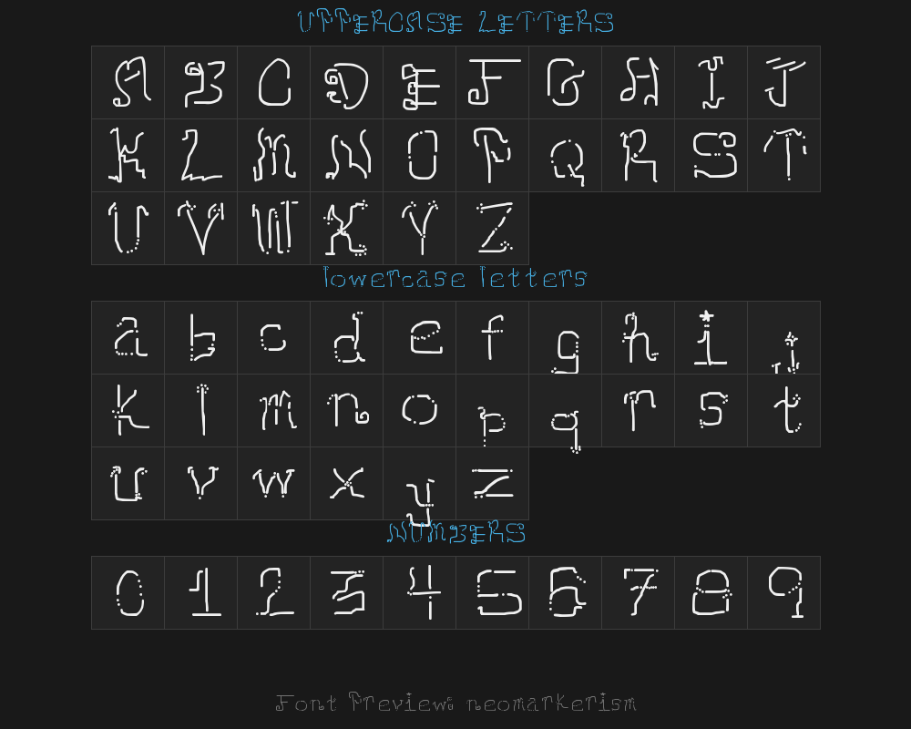 neomarkerism is a font file with a size of 0.02 MB. The full font name is Neomarkerism, Version 1.00 version. It contains 74 characters, supports 8 Chinese characters. The copyright belongs to Neomarkerism. neomarkerism font is available for free download, but commercial use requires confirmation on the Neomarkerism official website whether it's free for commercial use.