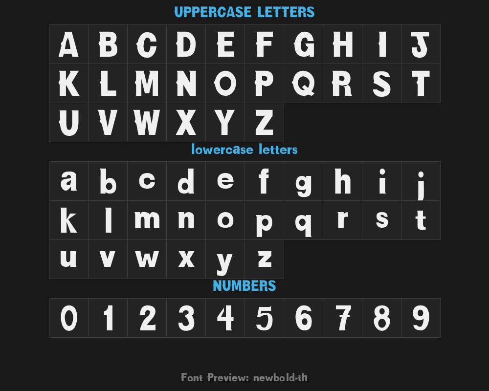 newbold-th is a font file with a size of 0.04 MB. The full font name is NewBold Th, 1.0 version. It contains 394 characters, supports 8 Chinese characters. The copyright belongs to NewBold Th. newbold-th font is available for free download, but commercial use requires confirmation on the NewBold Th official website whether it's free for commercial use.