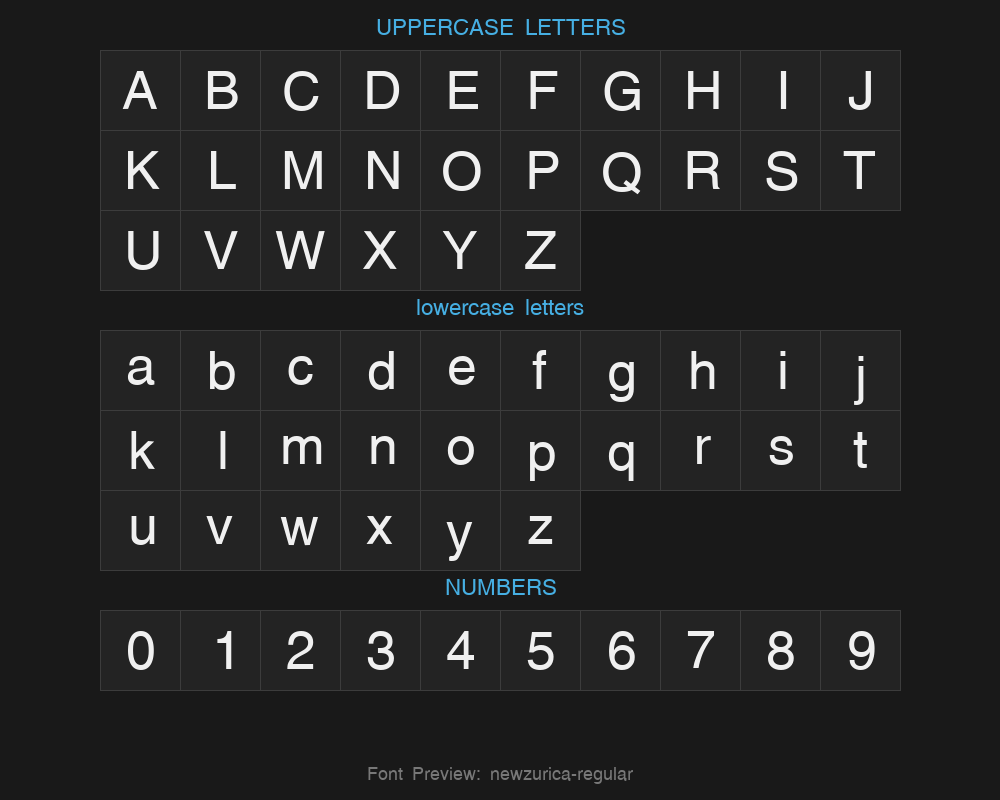 newzurica-regular is a font file with a size of 0.04 MB. The full font name is NewZurica Regular, Altsys Fontographer 3.5 7 21 93 version. It contains 245 characters, supports 8 Chinese characters. The copyright belongs to NewZurica. newzurica-regular font is available for free download, but commercial use requires confirmation on the NewZurica official website whether it's free for commercial use.