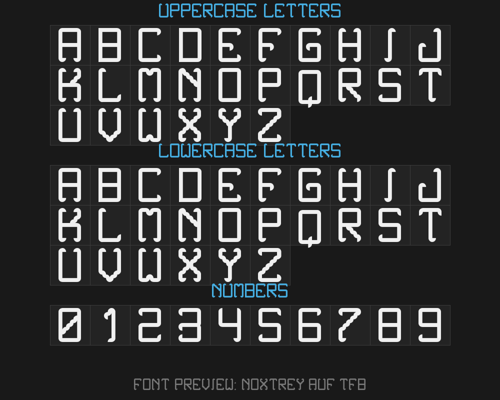 noxtrey-auf-tfb is a font file with a size of 0.01 MB. The full font name is Noxtrey Auf tfb, Version 1.00 February 11, 2013, initial release version. It contains 240 characters, supports 8 Chinese characters. The copyright belongs to Noxtrey Auf tfb. noxtrey-auf-tfb font is available for free download, but commercial use requires confirmation on the Noxtrey Auf tfb official website whether it's free for commercial use.