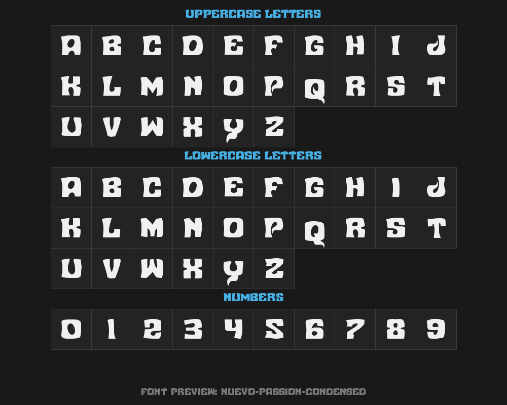 nuevo-passion-condensed is a font file with a size of 0.06 MB. The full font name is Nuevo Passion Condensed, Version 1.0; 2013 version. It contains 219 characters, supports 8 Chinese characters. The copyright belongs to Nuevo Passion Condensed. nuevo-passion-condensed font is available for free download, but commercial use requires confirmation on the Nuevo Passion Condensed official website whether it's free for commercial use.