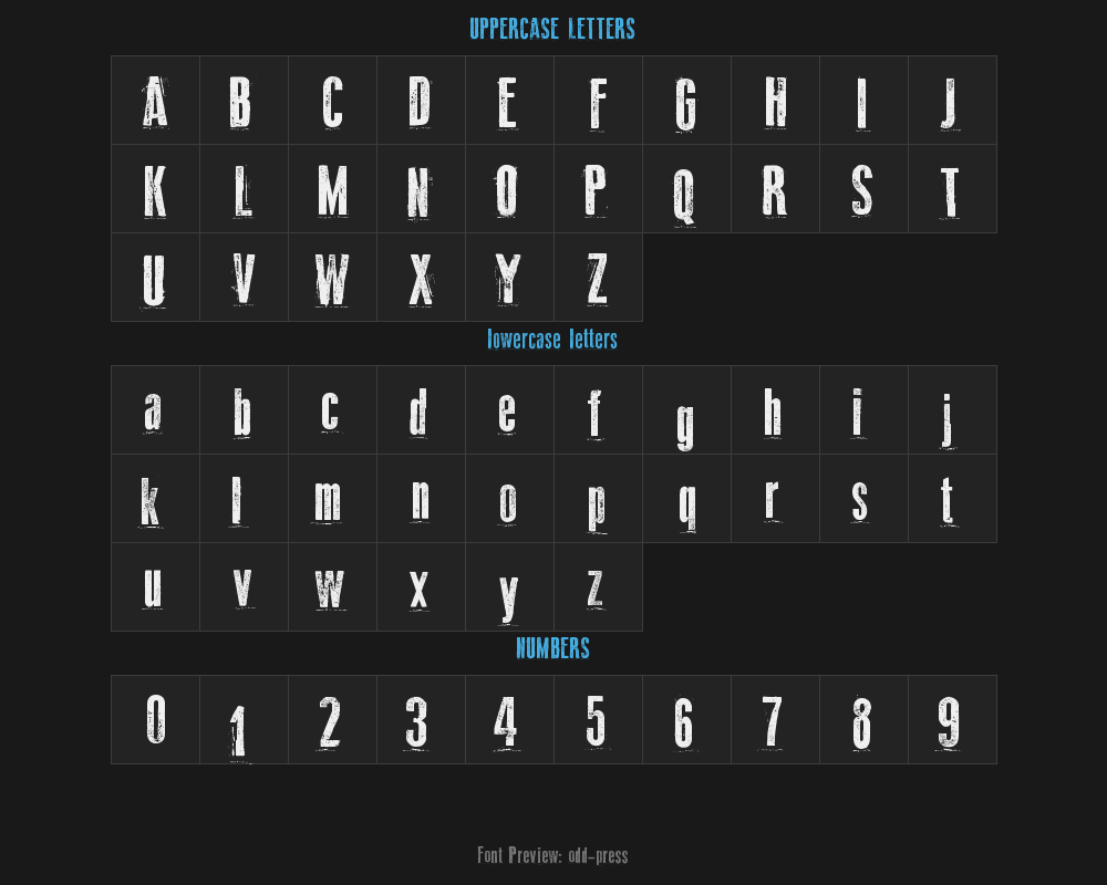 odd-press is a font file with a size of 0.83 MB. The full font name is Odd Press, Version 1.00 March 29, 2014, initial release version. It contains 212 characters, supports 8 Chinese characters. The copyright belongs to Odd Press. odd-press font is available for free download, but commercial use requires confirmation on the Odd Press official website whether it's free for commercial use.