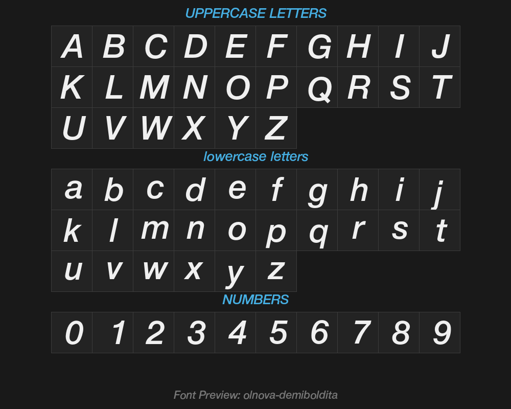| Font family name | Olnova-DemiBoldIta |
