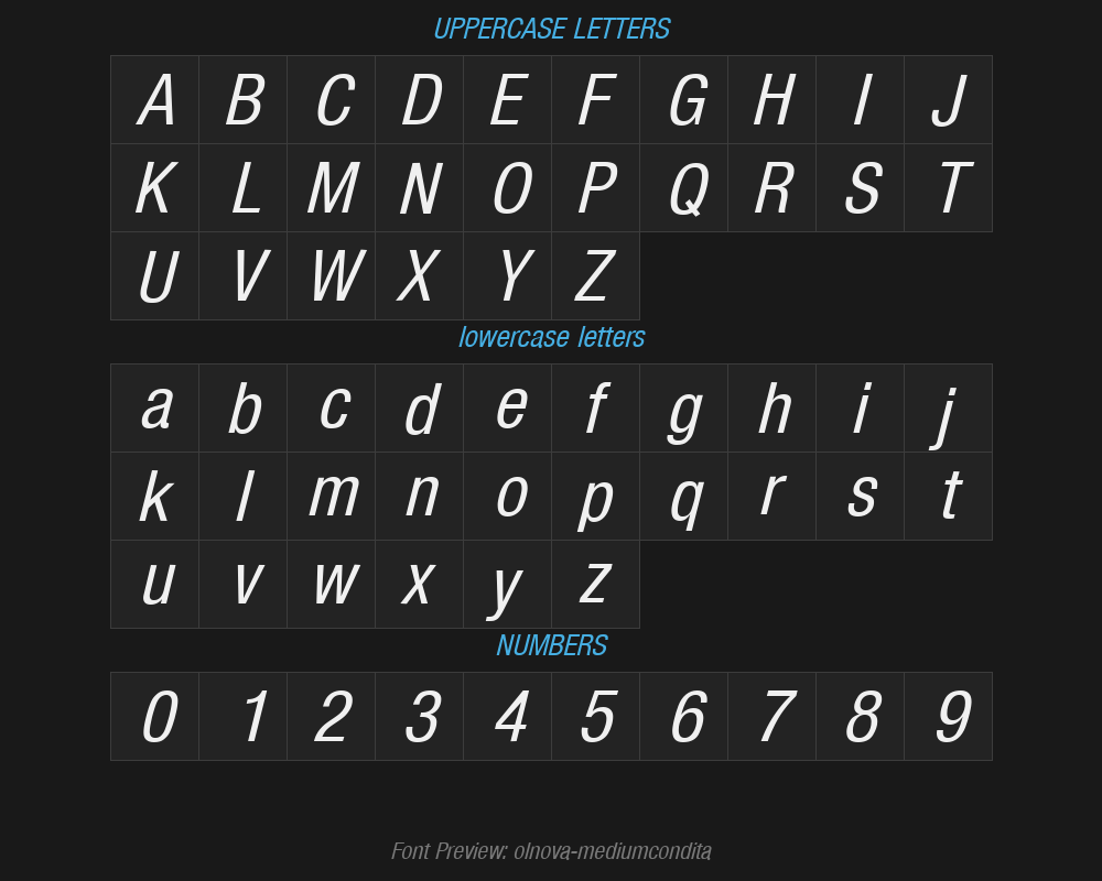 olnova-mediumcondita is a font file with a size of 0.04 MB. The full font name is Olnova-MediumCondIta, B & P Graphics Ltd. 26.6.1993 version. It contains 224 characters, supports 8 Chinese characters. The copyright belongs to Olnova-MediumCondIta. olnova-mediumcondita font is available for free download, but commercial use requires confirmation on the Olnova-MediumCondIta official website whether it's free for commercial use.