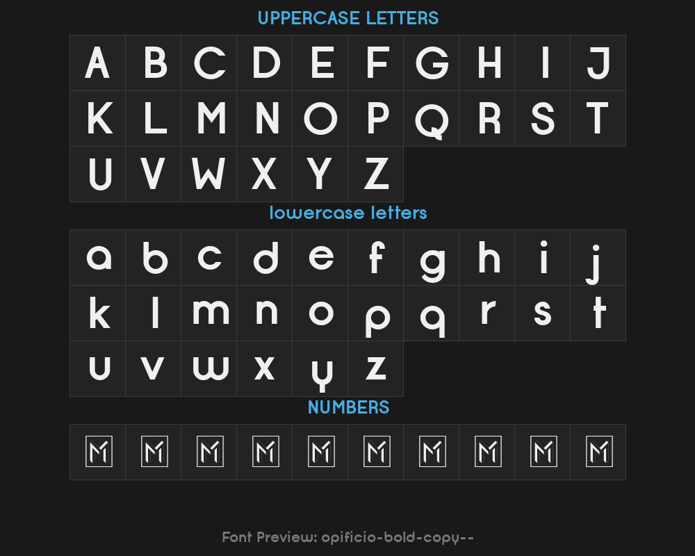 opificio-bold-copy-1- is a font file with a size of 0.08 MB. The full font name is Opificio Bold, Version 2.000 version. It contains 252 characters, supports 8 Chinese characters. The copyright belongs to Opificio. opificio-bold-copy-1- font is available for free download, but commercial use requires confirmation on the Opificio official website whether it's free for commercial use.