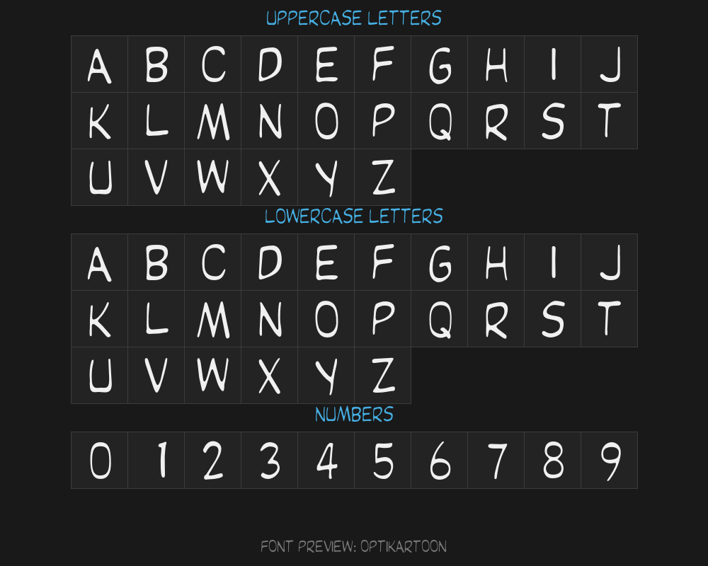 optikartoon is a font file with a size of 0.04 MB. The full font name is OPTIKartoon, 001.000 version. It contains 176 characters, supports 8 Chinese characters. The copyright belongs to OPTIKartoon. optikartoon font is available for free download, but commercial use requires confirmation on the OPTIKartoon official website whether it's free for commercial use.