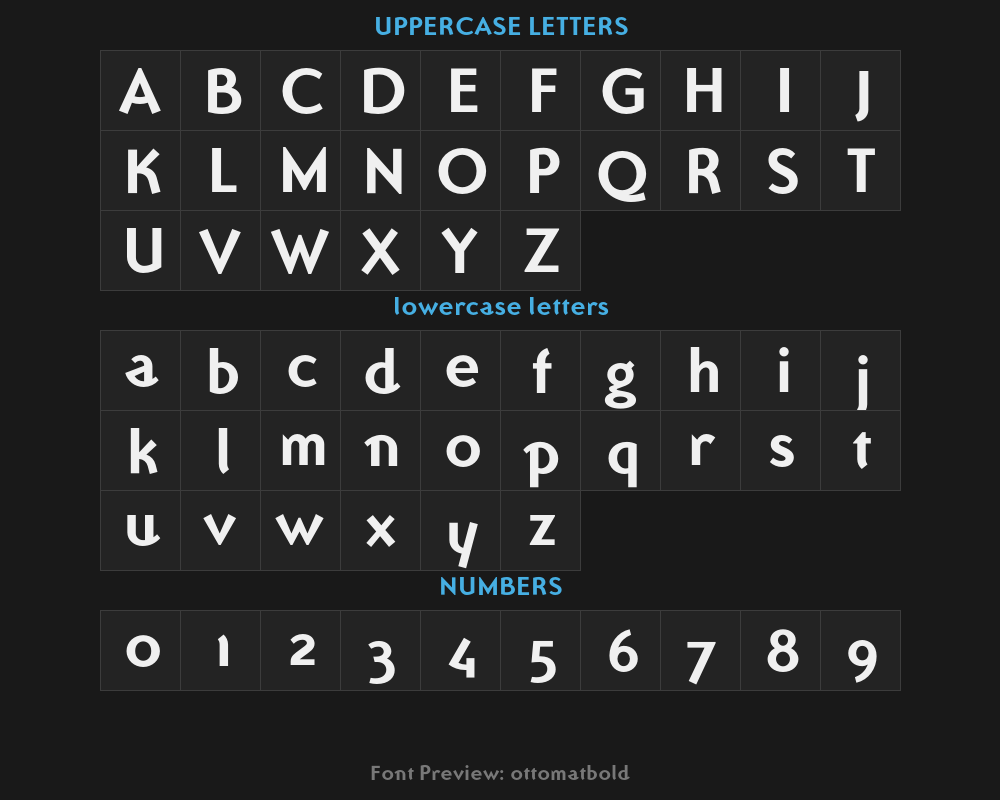 ottomatbold is a font file with a size of 0.03 MB. The full font name is OttomatBold, 001.000 version. It contains 244 characters, supports 8 Chinese characters. The copyright belongs to Ottomat. ottomatbold font is available for free download, but commercial use requires confirmation on the Ottomat official website whether it's free for commercial use.