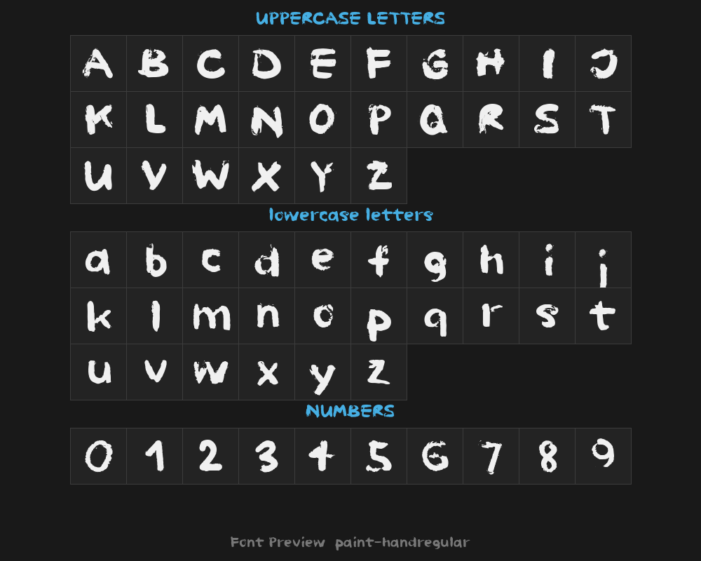 paint-handregular is a font file with a size of 0.30 MB. The full font name is Paint HandRegular, Version 1.000 version. It contains 245 characters, supports 8 Chinese characters. The copyright belongs to Paint Hand. paint-handregular font is available for free download, but commercial use requires confirmation on the Paint Hand official website whether it's free for commercial use.