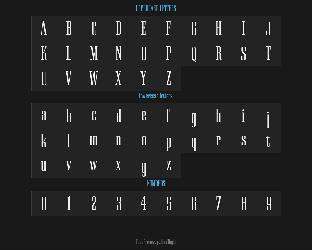pallmalllight is a font file with a size of 0.05 MB. The full font name is PallMallLight, April 9, 1993 v1.1i version. It contains 224 characters, supports 8 Chinese characters. The copyright belongs to PallMallLight. pallmalllight font is available for free download, but commercial use requires confirmation on the PallMallLight official website whether it's free for commercial use.