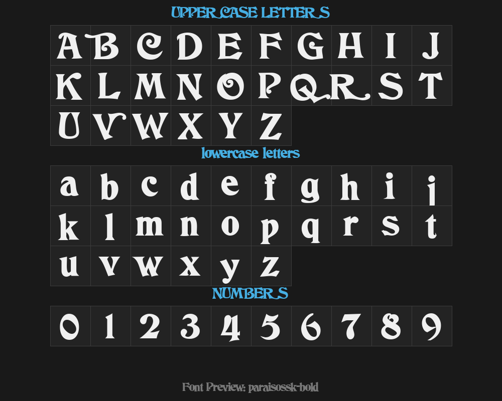 paraisossk-bold is a font file with a size of 0.07 MB. The full font name is ParaisoSSK Bold, Macromedia Fontographer 4.1 8 13 95 version. It contains 234 characters, supports 8 Chinese characters. The copyright belongs to ParaisoSSK. paraisossk-bold font is available for free download, but commercial use requires confirmation on the ParaisoSSK official website whether it's free for commercial use.