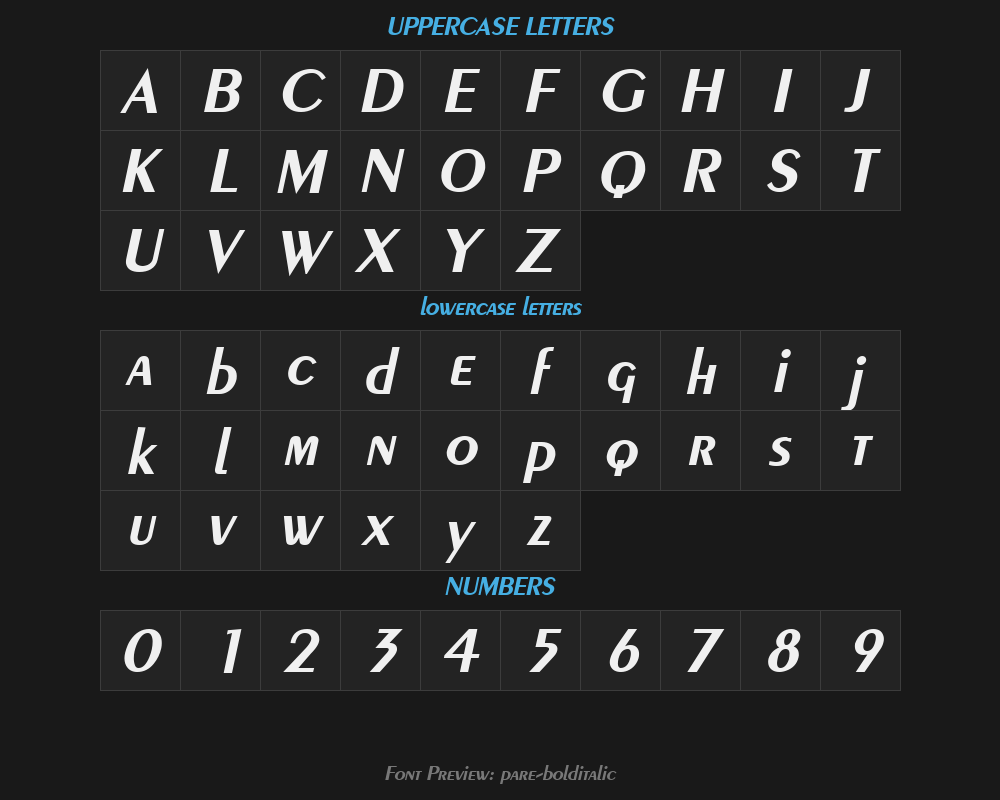 pare-bolditalic is a font file with a size of 0.05 MB. The full font name is Pare BoldItalic, Altsys Fontographer 4.1 1 9 95 version. It contains 225 characters, supports 8 Chinese characters. The copyright belongs to Pare. pare-bolditalic font is available for free download, but commercial use requires confirmation on the Pare official website whether it's free for commercial use.