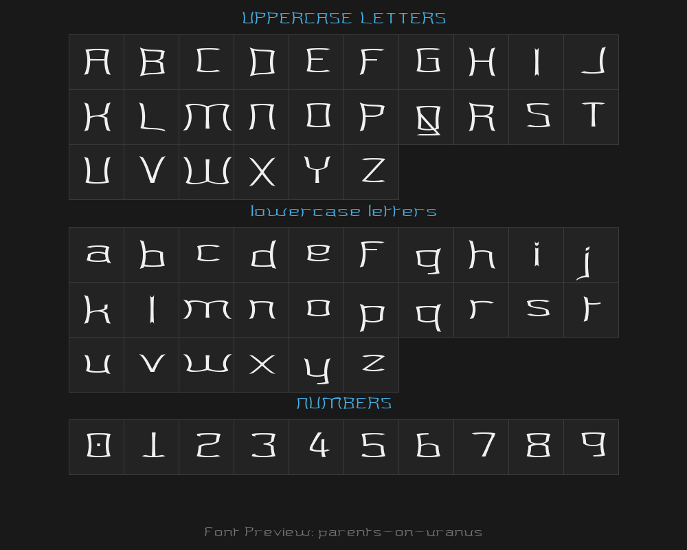 parents-on-uranus is a font file with a size of 0.06 MB. The full font name is Parents on Uranus, 1 version. It contains 219 characters, supports 8 Chinese characters. The copyright belongs to Parents on Uranus. parents-on-uranus font is available for free download, but commercial use requires confirmation on the Parents on Uranus official website whether it's free for commercial use.
