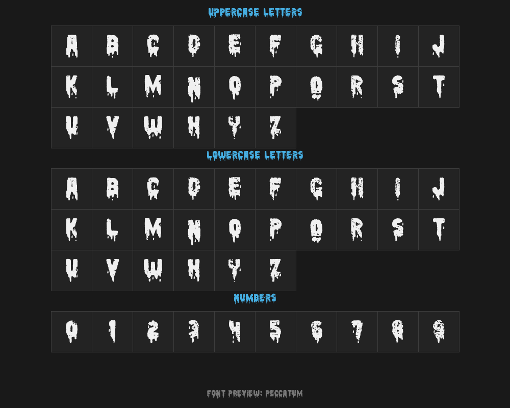 peccatum is a font file with a size of 0.32 MB. The full font name is Peccatum, Version 1.00 June 1, 2015, initial release version. It contains 240 characters, supports 8 Chinese characters. The copyright belongs to Peccatum. peccatum font is available for free download, but commercial use requires confirmation on the Peccatum official website whether it's free for commercial use.