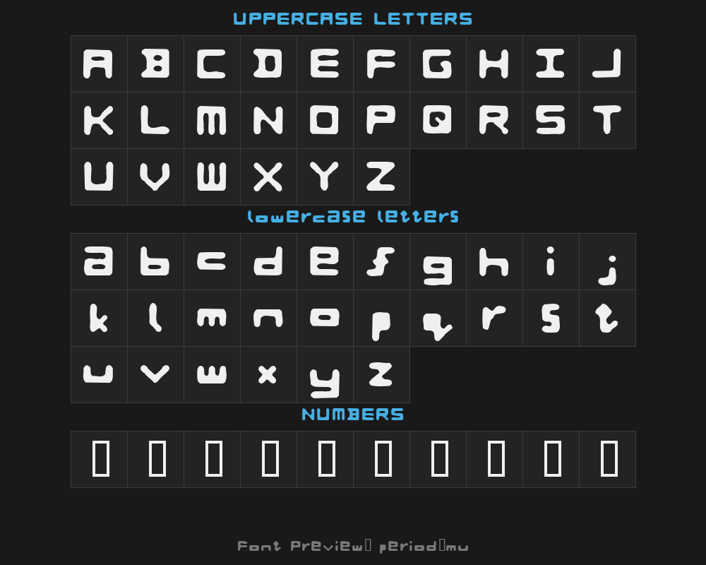 period-mu is a font file with a size of 0.02 MB. The full font name is Period Mu, Macromedia Fontographer 4.1 03 12 98 version. It contains 54 characters, supports 8 Chinese characters. The copyright belongs to Period Mu. period-mu font is available for free download, but commercial use requires confirmation on the Period Mu official website whether it's free for commercial use.