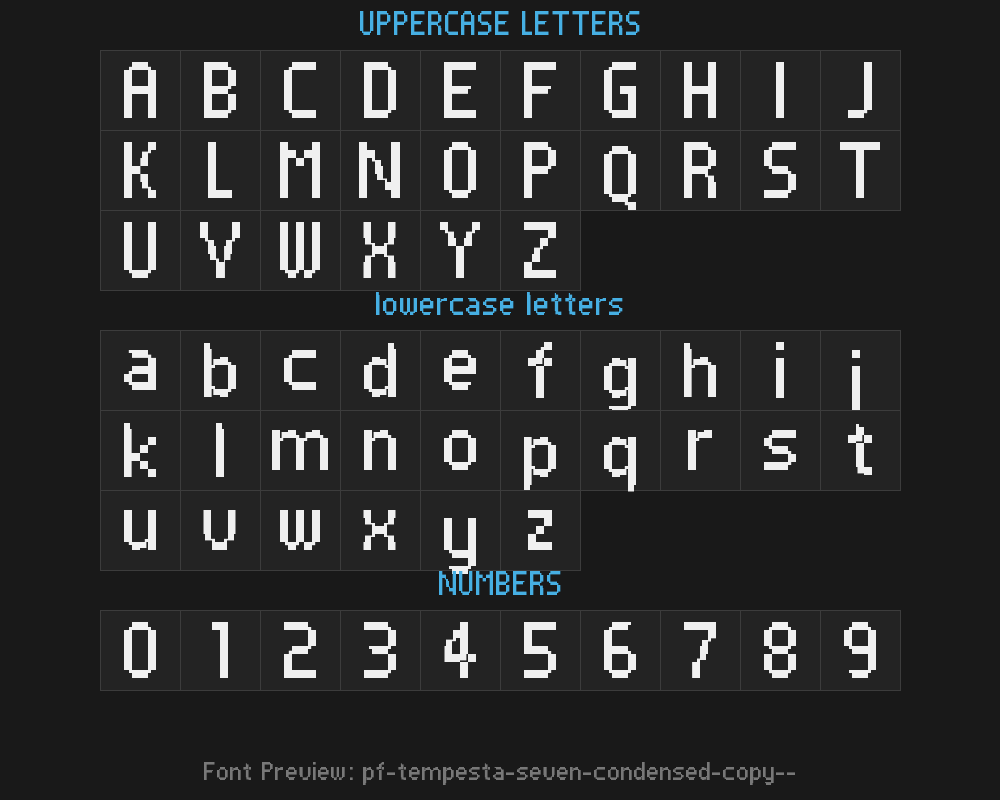 pf-tempesta-seven-condensed-copy-2- is a font file with a size of 0.02 MB. The full font name is PF Tempesta Seven Condensed, Version 1.2 version. It contains 229 characters, supports 8 Chinese characters. The copyright belongs to PF Tempesta Seven Condensed. pf-tempesta-seven-condensed-copy-2- font is available for free download, but commercial use requires confirmation on the PF Tempesta Seven Condensed official website whether it's free for commercial use.