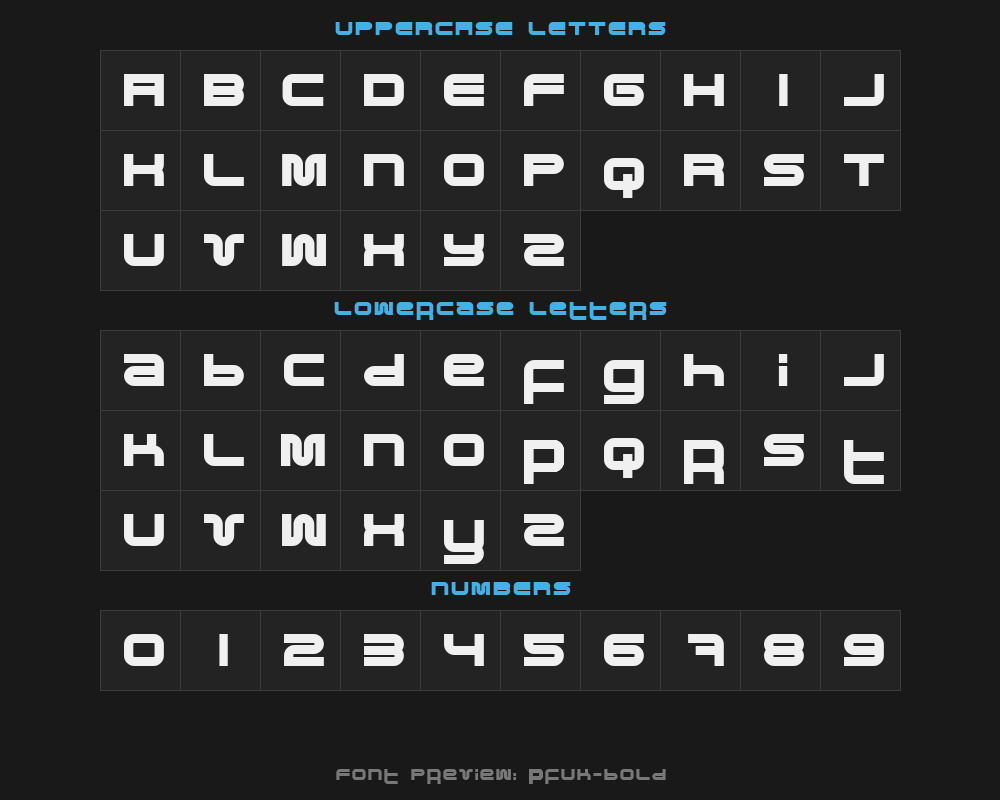 pfuk-bold is a font file with a size of 0.02 MB. The full font name is Pfuk Bold, Version 1.0 version. It contains 92 characters, supports 8 Chinese characters. The copyright belongs to Pfuk. pfuk-bold font is available for free download, but commercial use requires confirmation on the Pfuk official website whether it's free for commercial use.